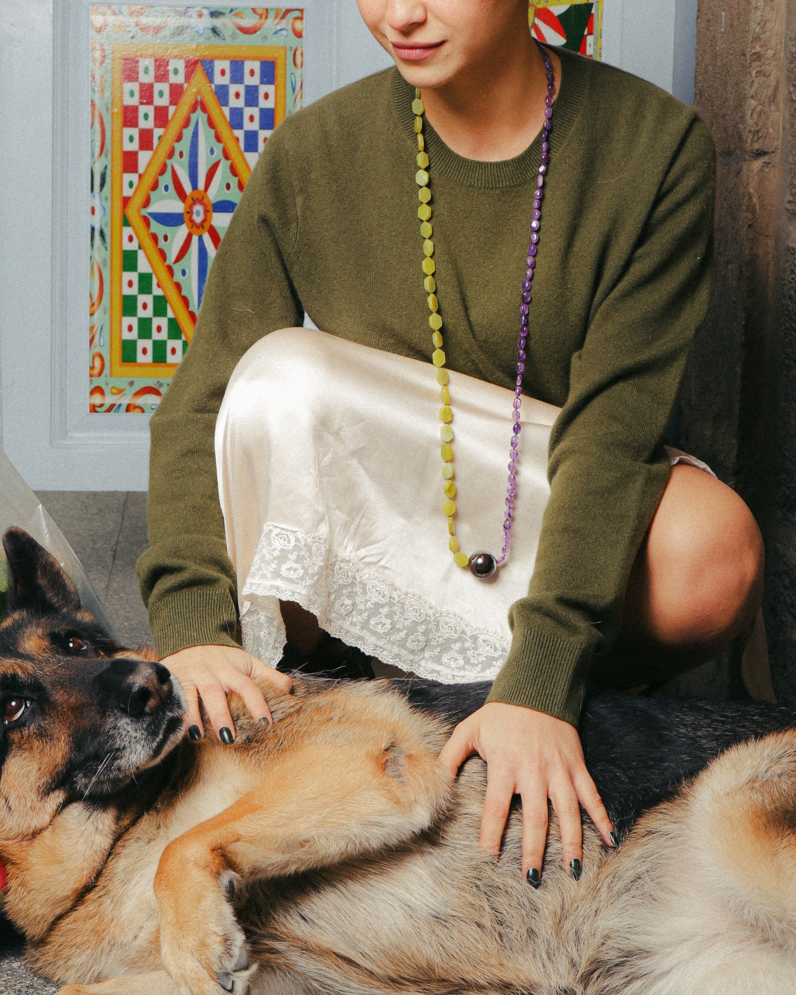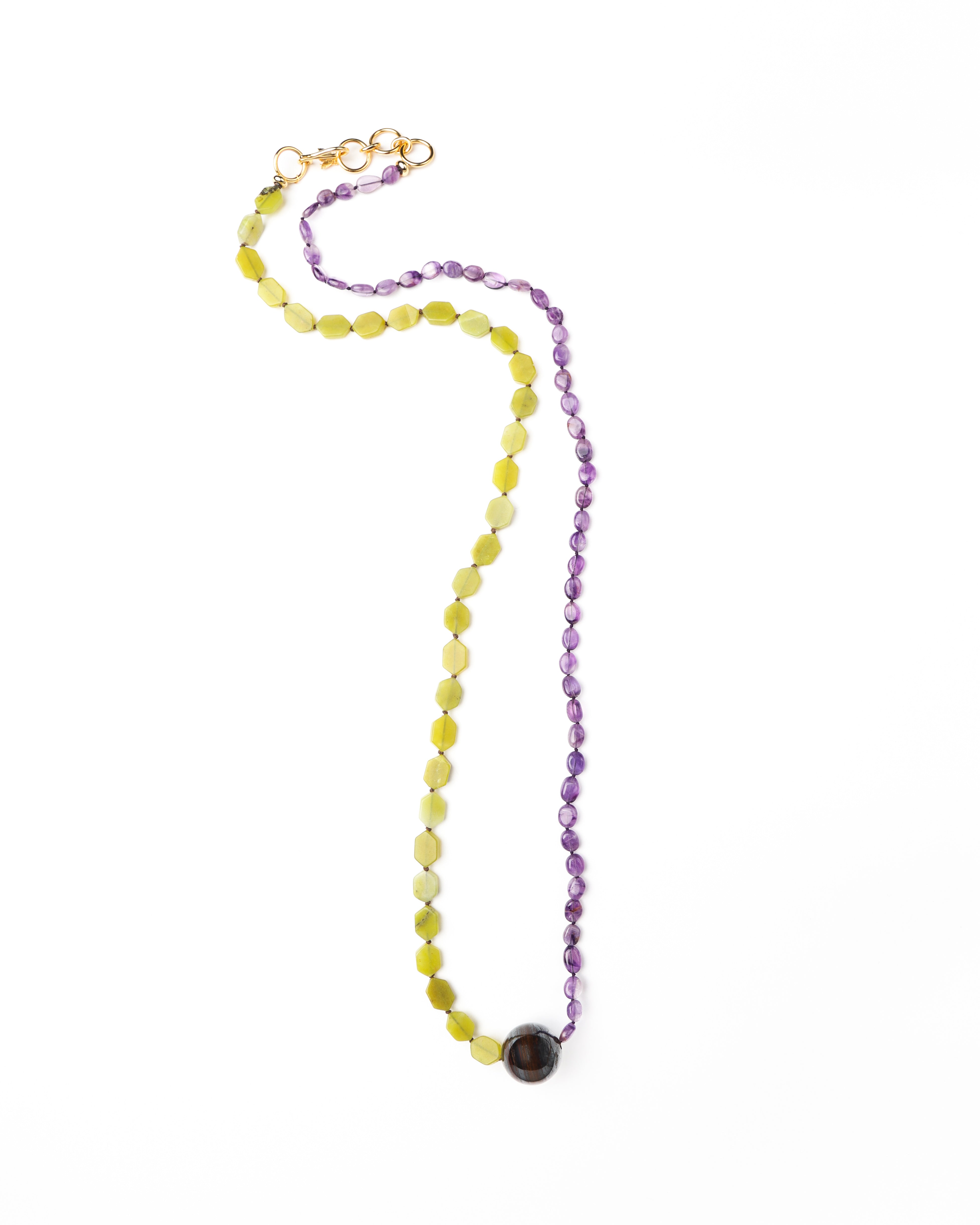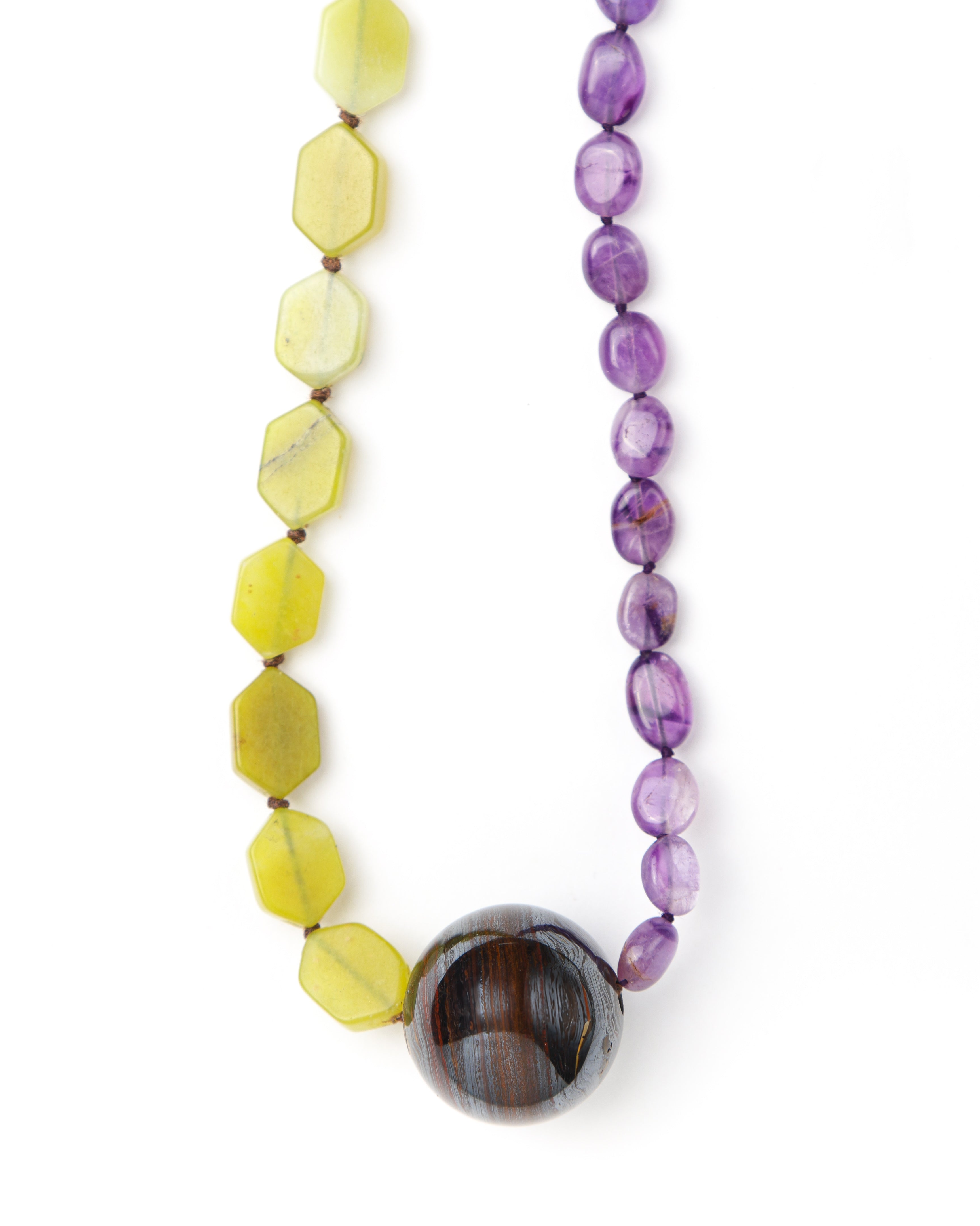 For the woman who believes every day holds something beautiful: With its mix of green stones, light purple semi-precious beads, and a deep brown accent at the center, L’Optimiste reflects her radiant spirit: bright, curious, and endlessly full of life.
