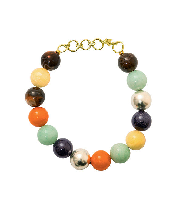 For the silver lovers who are drawn to pieces that make heads turn: a bold mix of silver-plated spheres, semi-precious stones, and resin beads. Bold, round, and full of life.