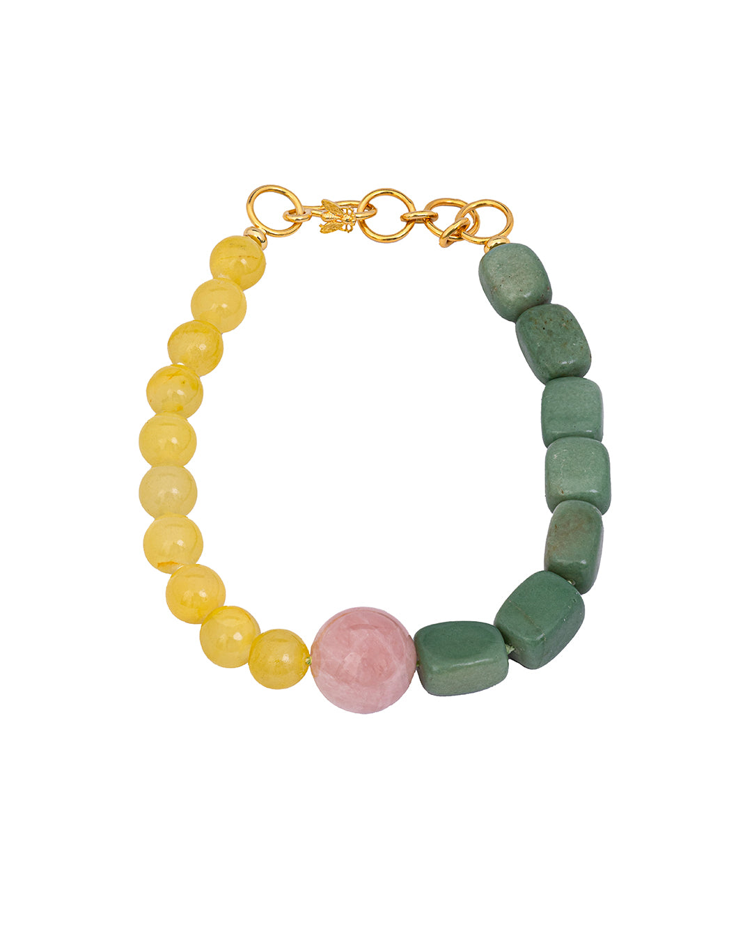 For those who carry the sun with them: Made with semi-precious yellow stones, natural green stones, and a soft pink semi-precious centerpiece, this necklace feels like a slow summer afternoon bottled up. Bright, balanced, and a little unexpected — just the way we like it.