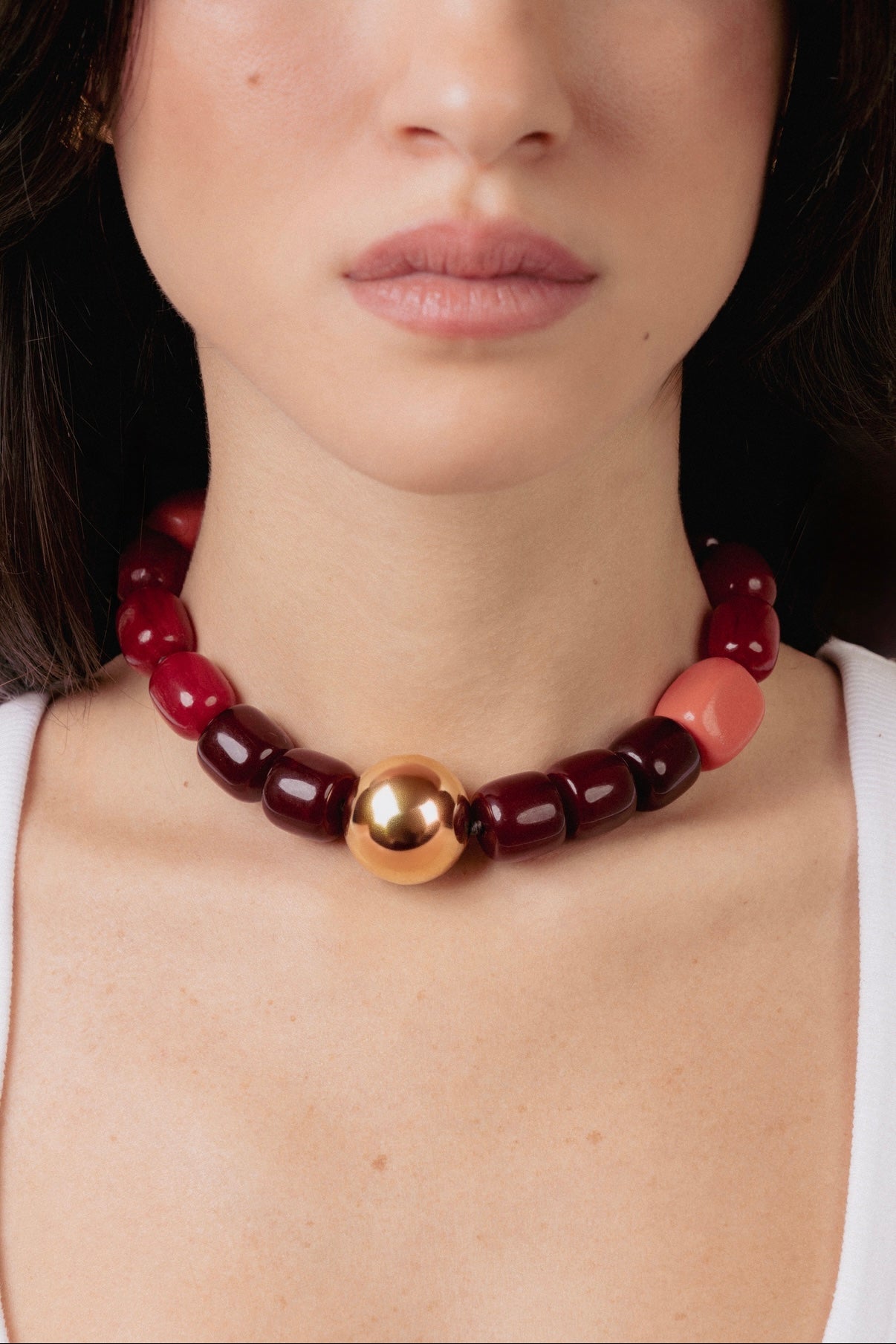 For those who love color that speaks without trying: A smooth 18k gold-plated sphere centers this short necklace, met by a mix of deep red and lie-de-vin resin beads, softened with pink natural stones on each side. Bold tones, easy balance.